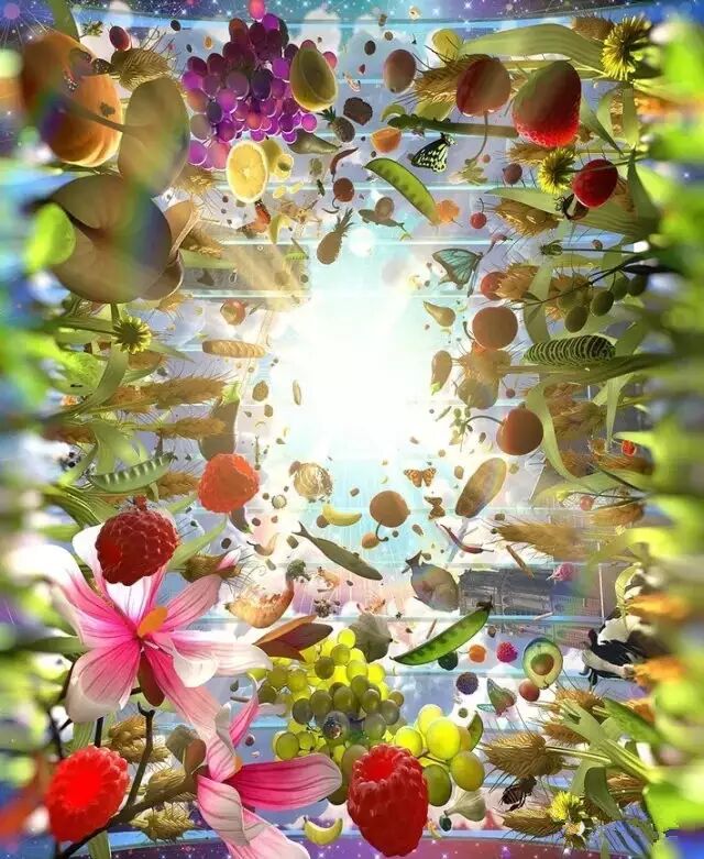 畫面裡的新鮮蔬果、麵包、花卉是在向荷蘭黃金時代的靜物油畫致敬。而中間的太陽,不但呼應了從拱形頂端窗戶中透進的天光,又烘托出豐足天堂的室內氛圍。這一留白還為夜裡的投影提供了幕布,可謂心機重重。