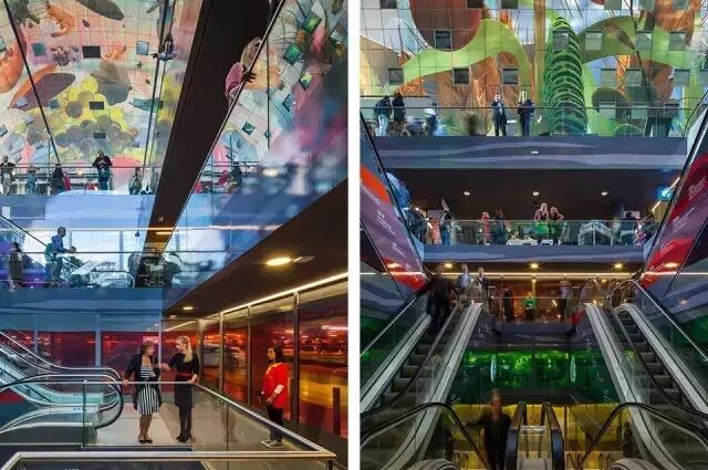 1、拱形獨特造型是菜市場成為景觀地標的因素之一,況且,中庭尺度為120m x 70m x 40m,這個尺度能給人帶來獨特的體驗,雖然容積率大大拉低,但是體驗性升高了百倍。並且,頂部的巨型壁畫配合豐富的業態也給體驗增添了濃厚的樂趣。