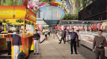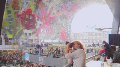 高40米,佔地約為足球場大的巨大中空拱形樓房,兩側全玻璃面牆,視野通透得可以看到內部繽紛熱鬧的市場,都讓人沒法不多瞧一眼,再衝動地走進逛逛。夜裡暮色初上時,泛光燈將天頂畫點亮,大塊面的絢爛色彩直接驚艷了整個街區!